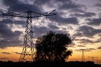 Een mooie kleurrijke zonsondergang met hoogspanningsmasten en het silhouette van een boom als onderwerp. De kleuren van de wolken kleuren mooi blauw. Deze foto is genomen in Elshout (Noord-brabant).