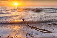 Zonsondergang over het rustige Kattegat met een aangespoelde tak op het strand bij Hove, Vig-Lyng in Denemarken, regio Seeland. Deze foto is gemaakt in het voorjaar van 2015.