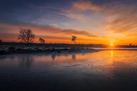 De foto toont een sfeervol beeld van de Loonse en Drunense Duinen bij zonsondergang. Een dunne ijslaag bedekt de vlaktes, weerspiegelend in de warme kleuren van de ondergaande zon. De bomen in de voorgrond reflecteren op het ijs, wat een serene en betoverende atmosfeer creëert. Het geheel vormt een harmonieus schouwspel van tijdloze…