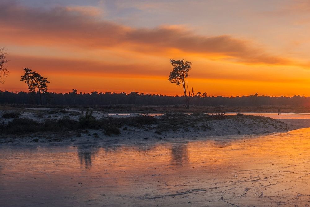 De foto toont een sfeervol beeld van de Loonse en Drunense Duinen bij zonsondergang. Een dunne ijslaag bedekt de vlaktes, weerspiegelend in de warme kleuren van de ondergaande zon. De bomen in de voorgrond reflecteren op het ijs, wat een serene en betoverende atmosfeer creëert. Het geheel vormt een harmonieus schouwspel van tijdloze schoonheid in deze bijzondere natuurlijke omgeving.