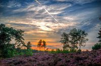 De dagen worden in augustus alweer korter en de luchten spreken mee. Het landgoed Den Treek/Henschoten is een mooi open en gesloten natuurgebied vlak onder Amersfoort in de gemeente Leusden. De heide bloeit nog kort in deze periode maar geeft wel een bijzondere kleur als de zon ondergaat. Het is bijna half negen in de avond. De kleuren in de lucht varieren per minuut en een vliegtuig doorkruist die hegemonie. Het zijn fascinerende momenten die helaas maar kort duren. Gelukkig heb je daar foto's voor met dit soort moment opnames!
