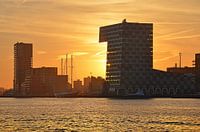 Een zonsondergang boven Rotterdam, op een van de vele plaatsen waar haven en stad elkaar ontmoeten. Het Lloydkwartier, gezien vanaf Katendrecht, bij het SS Rotterdam, met op de voorgrond de Nieuwe Maas. Het grote gebouw rechts in het beeld is het Scheepvaart- en Transportcollege,; verder naar links is de woningbouw op de kop van de Lloydpier te zien. De aangemeerde driemaster is het opleidingsschip De Eendracht. Geheel rechts is nog net een installatie van de jaarlijkse voorjaarskermis te zien.