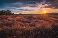 De in bloei staande heide op de Loonse en Drunense Duinen bij zonsondergang, met de zon aan de rechterkant.
