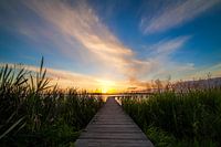 Zonsondergang in het verlengde van de Loopbrug in het Dannemeer dat ligt in het natuurgebied 't Roegwold ten oosten van de stad Groningen.