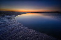 Prachtige kleurrijke zonsondergang op het Slufterstrand van de Maasvlakte, met reflectie van het licht in achterbleven zeewater op het strand.
