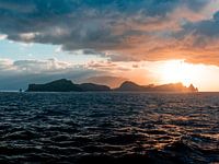 De schiereilanden van Madeira, vanaf zee in het gouden licht van de zonsondergang. Golven en wolken laten de kracht van de natuur zien.