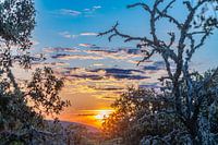 Een prachtige sfeerplaat van een zonsondergang in Monfrague Nationaal Park in Extremadura. Het silhouet van de dode Steeneik behangen met korstmossen vormt een abstracte en dromerige omlijsting . Van April tot begin Mei is deze groene streek met zijn vele prachtige landschappen, flora en fauna op zijn mooist