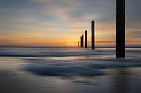 De zon gaat onder aan het Noordzeestrand bij Noordwijkerhout. De lange sluitertijd opname heeft een mooi resultaat opgeleverd. De palen die vanaf het strand tot in de zee zijn geplaatst leveren een fraai effect op.