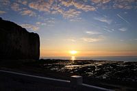 Prachtige zonsondergang aan het kiezelstrand van Vaucottes sur Mer in Normandië