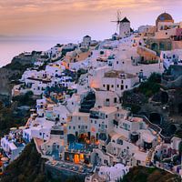 Een avond in Oia, op het noordelijke puntje van Santorini, een van de Cycladen-eilanden in de Egeïsche Zee, Griekenland.