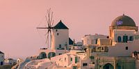 Een 2x1 foto van een avond bij de stad Oia, op het noordelijke puntje van Santorini, een van de Cycladen-eilanden in de Egeïsche Zee, Griekenland.