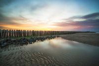 Een fraai gekleurde lucht boven een rij strandpaaltjes tijdens zonsondergang, in de buurt van strandpaviljoen Berkenbosch bij Oostkapelle, Zeeland.