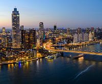 De skyline van Rotterdam bij zonsondergang in het centrum met de Erasmusbrug en de wolkenkrabber Zalmhaven vanaf een hoog uitkijkpunt. De Zalmhaven, het hoogste gebouw van Nederland, is een opvallende wolkenkrabber die met zijn scherpe, hoekige lijnen boven de skyline uittorent. De straten beneden gonzen van de bedrijvigheid terwijl de moderne architectuur van de stad'trots in de verte staat, badend in zacht stedelijk licht. Boven de heldere hemel staan een paar sterren die nauwelijks zichtbaar zijn door de felle gloed van de stadslichten, wat bijdraagt aan de futuristische en toch serene sfeer van Rotterdam bij nacht.