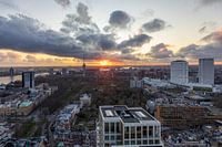 Zonsondergang in Rotterdam is altijd een feest. Maar van deze unieke locatie helemaal. De foto is gemaakt vanaf de 30e etage van de zalmhaventoren en geeft mooi zich vanaf de Euromast tot het Erasmus MC.