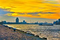 Deze foto van de Rotterdamse haven met op de achtergrond een verbazingwekkende zonsondergang is genomen met mijn rug gericht op de Erasmusbrug. Weer eens wat anders dan de meest befaamde brug van Nederland op het beeld. Mooie gele weerspiegeling op het water en een iet-wat bedreiging in de wolken.
