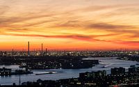 De zonsondergang zet de lucht boven de Rotterdamse haven in een oranje rode gloed. Op de rivier varen schepen en op de achtergrond zijn de schoorstenen van Pernis zien met hun eeuwige vlam. Een tijdloos industrieel beeld van de grootste haven van Europa.