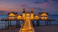 Zonsondergang bij de Sellin Pier (Duits: Seebrücke Sellin) in de Baltische badplaats Sellin op het Duitse eiland Rügen. De pier heeft een restaurant vlakbij het strand boven het water en heeft een duikgondel.