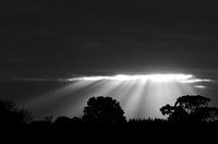 Deze zwart wit foto is gemaakt vlak voor zonsondergang bij zandverstuivingen natuurgebied Soestduinen (Lange Duinen). De keuze voor zwart wit versterkt de zonnestralen (stralenwaaier) die nog net even door de bewolking heen breken.