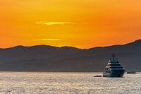 Een cruiseschip ligt bij zonsondergang voor de haven van St. Tropez op de Middellandse Zee met een prachtige oranje lucht boven de bergen op de achtergrond.