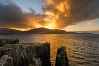 Mooie zonsondergang met uitzicht op de Quiraing vanaf Staffin Bay