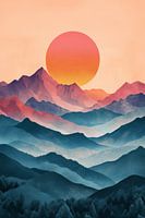 Een adembenemend berglandschap met lagen van kleurrijke bergen die zich uitstrekken tot de horizon, gedomineerd door een grote, gloeiende zon die de hemel in warme tinten hult, wat een gevoel van sereniteit en ontzag oproept.