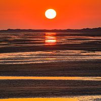Zonsondergang gezien vanuit West-Terschelling tijdens laag tij op het Nederlandse Waddenzee-eiland Terschelling, dat deel uitmaakt van de provincie in Friesland, Nederland.
