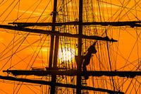 Zonsondergang in de haven van harlingen tussen de masten van de Thalassa