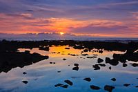 Een mooie en kleurrijke zonsondergang in de Stille Oceaan met lavarotsen op de voorgrond, gezien vanaf de The Big Island, Hawaii, Verenigde Staten.