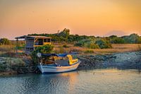 Orange gele zonsondergang in een Turks haventje met een klein vissershutje. Bergen en vogels op de achtergrond. Een mooie landschapsfoto voor aan de muur .