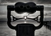 De foto toont een telescoop op de voorgrond, gericht tegen een dramatische hemel. De foto is in zwart-wit, wat de structuur van de telescoop en de lichtomstandigheden benadrukt. Een lichtstraal schijnt door het midden van de telescoop, afkomstig van de laagstaande zon op de achtergrond. De reflectie van het zonlicht op het water creëert…