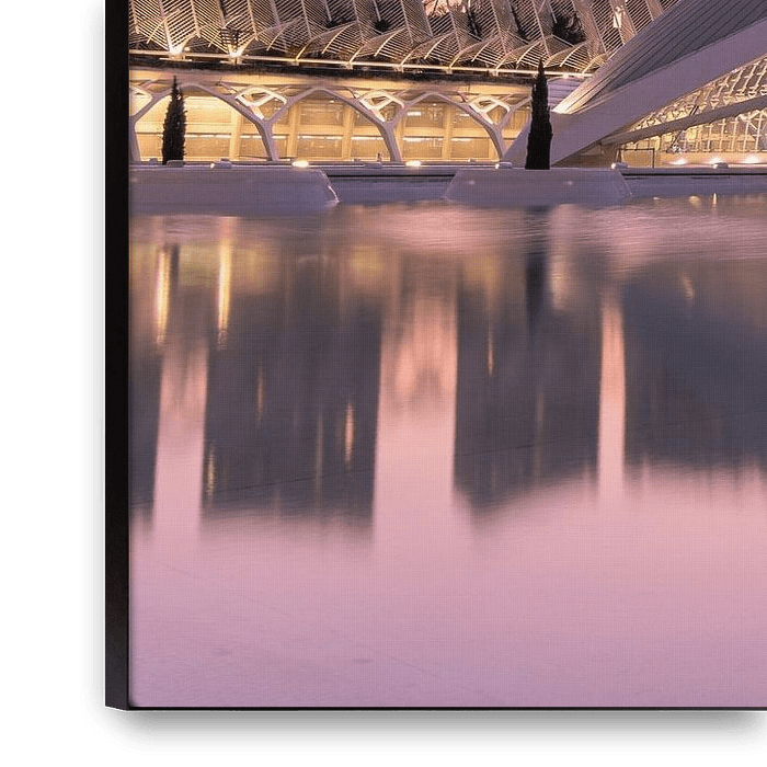 Een kijk op de stad van kunst en wetenschap in Valencia, tijdens de zonsondergang. Dit complex bestaat uit meedere gebouwen en is te vinden aan het begin van de Turia tuinen, in het centrum van de stad. Het is ontworpen door architect Santiago Calatrava en geopend in 1998, het laatste bouwerk was klaar in 2009.