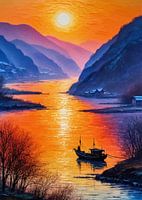 Een fascinerende zonsondergang over de Yangtze rivier, met de gouden tinten van de ondergaande zon die weerspiegelen op het kalme water. Een klein dorpje met traditionele Chinese architectuur ligt genesteld langs de rivieroever, rook stijgt zachtjes op uit de schoorstenen. Een groot, langzaam varend schip dobbert over de rivier en voegt een gevoel van beweging toe aan het serene tafereel. De oliepasteltechniek geeft textuur aan het stromende water en een zachte overgang naar de lucht, terwijl de warme tinten van de zonsondergang en koele schaduwen van het dorp een vredige, tijdloze sfeer creëren.