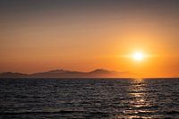 Deze prachtige foto legt de betoverende schoonheid van een zonsondergang aan zee op het adembenemende eiland Kos, Griekenland, vast. De ondergaande zon schildert de lucht in een palet van warme kleuren, terwijl de bergen op de achtergrond majestueus oprijzen.