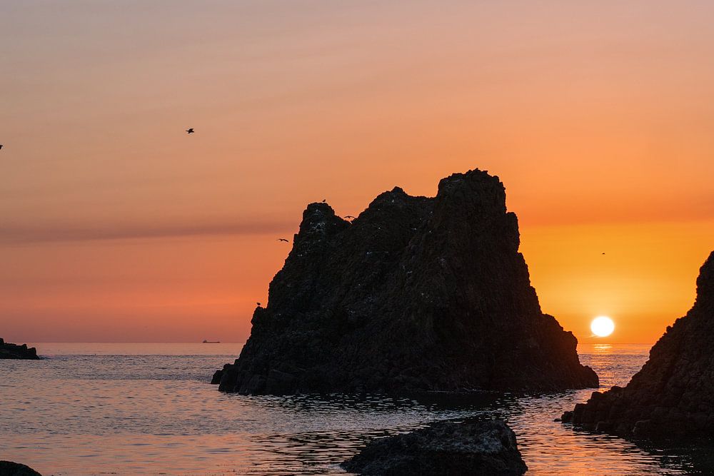 Mooie kleurrijke zonsondergang in de buurt van Ballintoy Harbour, aan de Antrim kust van Noord-Ierland.