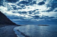 Zonsondergang aan de Deense kust. Strand, golven. Heuvels met bomen op de achtergrond. Landschapsfoto vanaf de zee.