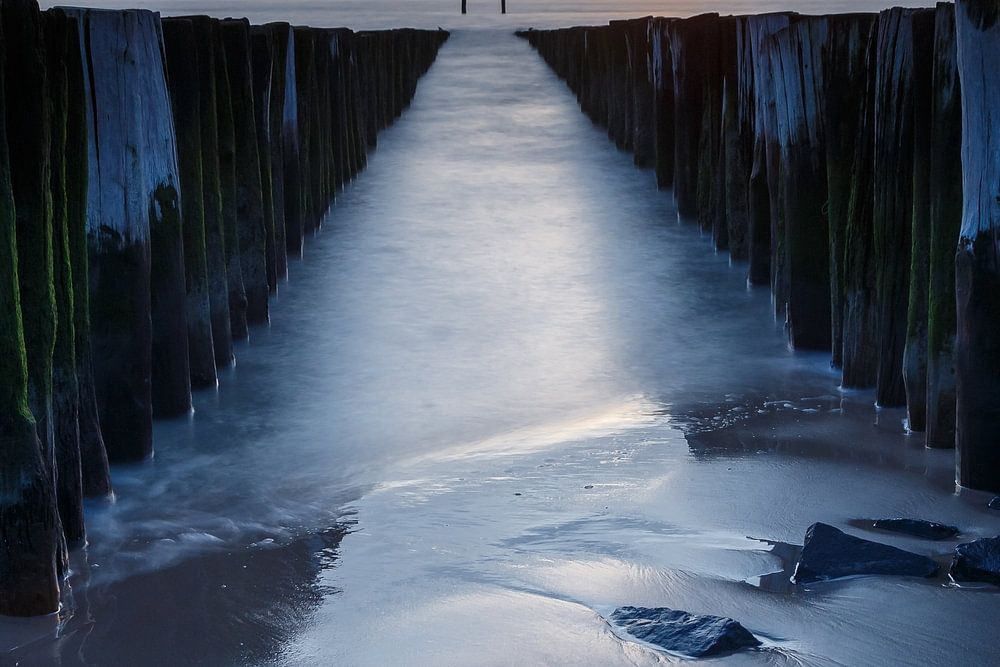 De ondergaande zon aan de kust van Zeeland, de houten palen die op het strand en in zee staan dienen als golfbrekers. De lucht kleurde prachtig blauw en oranje.