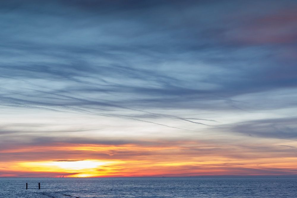De zon zakt in zee aan de horizon van het stand van Zoutelande Zeeland, de kenmerkende houten palen dienen als golfbrekers.