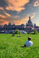 Zonsondergang aan de oever van de Elbe in het voorjaar in Dresden op de Elbwiese met de Frauenkirche op de achtergrond Verticaal