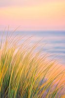 Zachte golven ontmoeten de kust, terwijl gouden grassprietjes zachtjes dansen in de wind. De lucht, verlicht in delicate pastelkleuren, weerspiegelt de rust van het water. De kleuren versmelten harmonieus en creëren een dromerig tafereel dat de ziel omarmt en je uitnodigt tot dromerige gedachten. Een moment vol rust en natuurlijke schoonheid.
