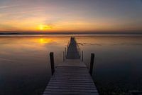 Zonsondergang aan een steiger in de Limfjord bij Hvalpsund, Denemarken, Europa |
