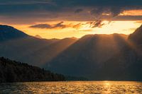 Zonsondergang aan het meer van Bohinj, gelegen in Nationaal Park Triglav en strekt zich uit langs de Italiaanse grens en dichtbij de Oostenrijkse grens in het noordwesten van Slovenië, dat wil zeggen in het zuidoostelijke deel van de Alpen.