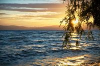 Zonsondergang door een tak van een boom gefotografeerd aan het meer van Ohrid.