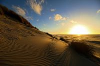 Warme zonsondergang met in de voorgrond de duinen en en in de verte de zee en de blauwe lucht