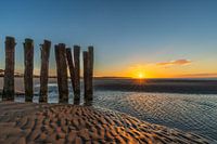 Zonsondergang tijdens eb bij de paalhoofden op het strand van Wissant aan de Opaalkust in Noord-Frankrijk.