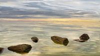Zonsondergang aan zee op een rustige dag met donkere en lichtere wolken. De lucht kleurt rood, geel, oranje vanwege de zinkende zon. Het kalme water heeft kleine en lage golven met kleine rimpelingen. De lucht reflecteert op de zee en de rotsen. Het ondiepe water rond de rotsen toont de zeebodem. Gemaakt aan de Ijsselmeer aan de Friese kust.