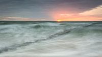 Zonsondergang over de zee met kribben in pastelkleuren.