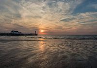 Zonsondergang aan zee. De mooie lijnen in het zand en de lucht benadrukken het mooie van de zonsondergang aan zee. De reflectie van het laatste zonlicht op het strand maakt dit beeld compleet.