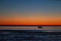 Een warme dag nadert zijn einde. De zon zakt in de zee en de reddingsbrigade vaart nog een rondje.