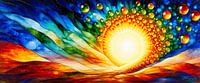 Een zonsondergang, opgelost in pure emotie - vlammende stromen van kleur stromen over de horizon, versmelten in een dans van warm rood, diep blauw en groen. De zon zelf is geen vast punt, maar een echo van licht verloren in oneindigheid, terwijl de lucht pulseert in een razernij van kleur.