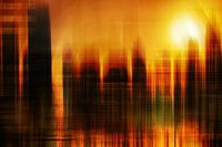 Zonsondergang achter wolkenkrabbers 2, skyline in de metropool met zon Abstracte meervoudige belichting